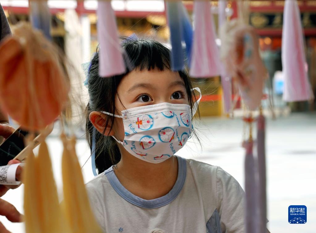 6月3日,一名小女孩在豫园老字号童涵春堂选购传统端午香囊。