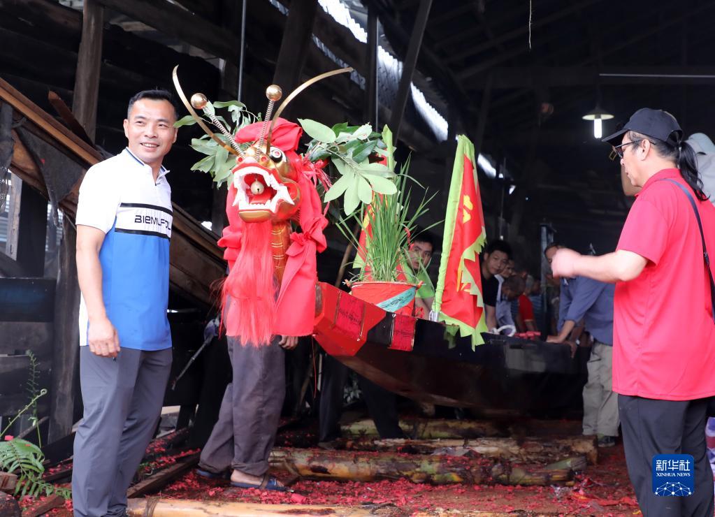 5月14日,在广州市番禺区上漖村“龙船世家”船厂,新“东坡号”龙舟举行传统的骏水仪式,人们合力推龙舟下水。