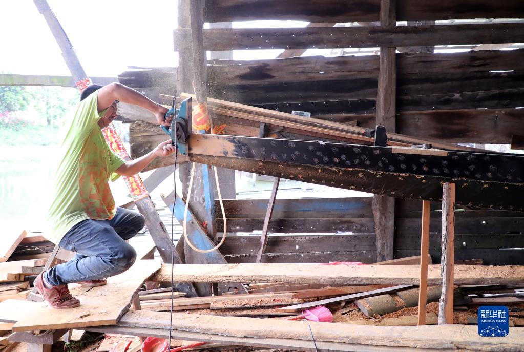 3月18日,在广州市番禺区上漖村“龙船世家”船厂,工匠在龙舟船体上裁切和打磨。