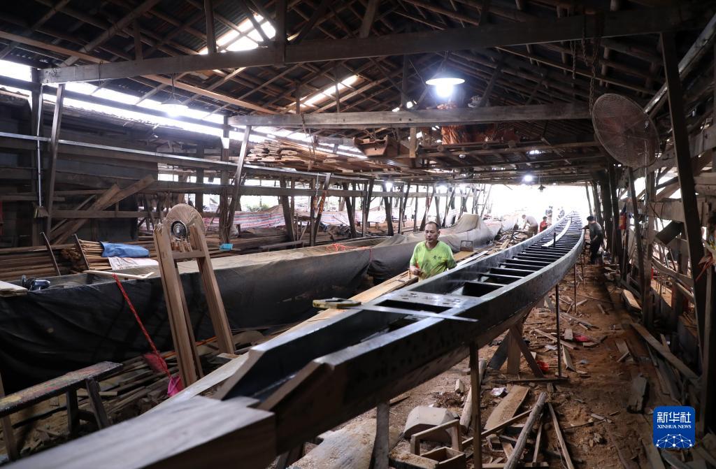 这是在广州市番禺区上漖村“龙船世家”船厂拍摄的新“东坡号”龙舟船体(3月18日摄)。