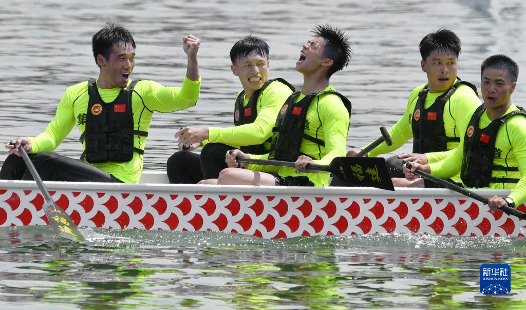 6月3日,在“龙腾虎跃”2022海峡两岸龙舟赛决赛现场,集美街道龙舟男队冲过终点。