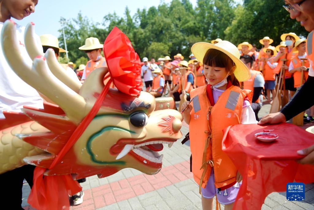 6月3日,在河南省洛阳市凌波湖,一名小朋友参加趣味龙舟赛点睛仪式。
