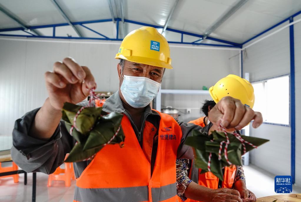 6月3日,中建三局一公司华东公司工人在位于上海的项目工地上展示包好的粽子。随着上海全面恢复正常生产生活秩序,建筑工程项目有序复工。