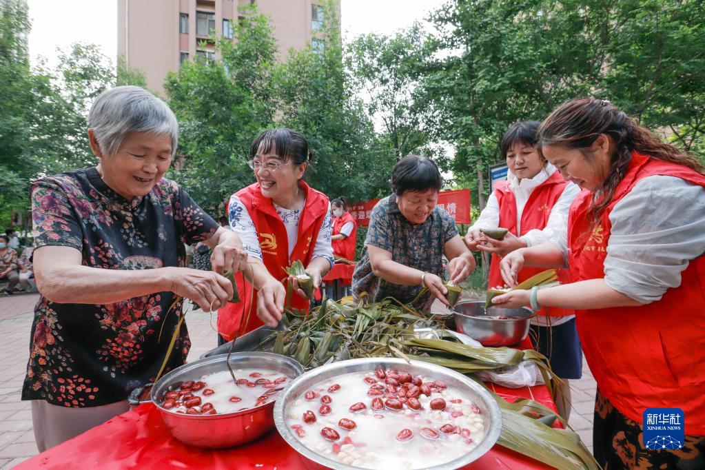 6月3日,志愿者在河北省遵化市华明路街道一社区和居民在一起包粽子。