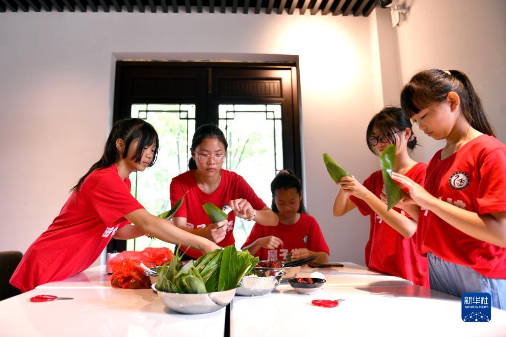 6月3日,在湖南省汨罗市屈子文化园,学生在体验包粽子。