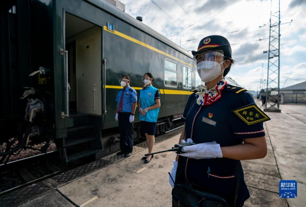 6月2日,5652次列车列车长袁琪珍(右一)和乘务员在小新街站等待群众上车。