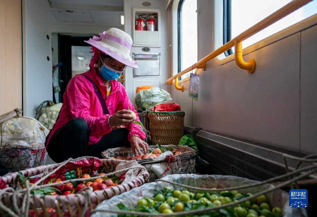 6月2日,5652次列车上,一名菜农在整理农产品。
