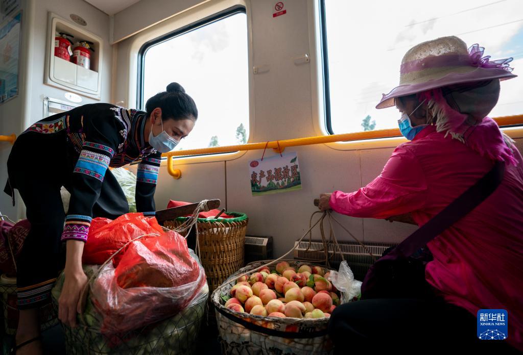 6月2日,5652次列车上一名志愿者(左)帮助一名菜农摆放农产品。