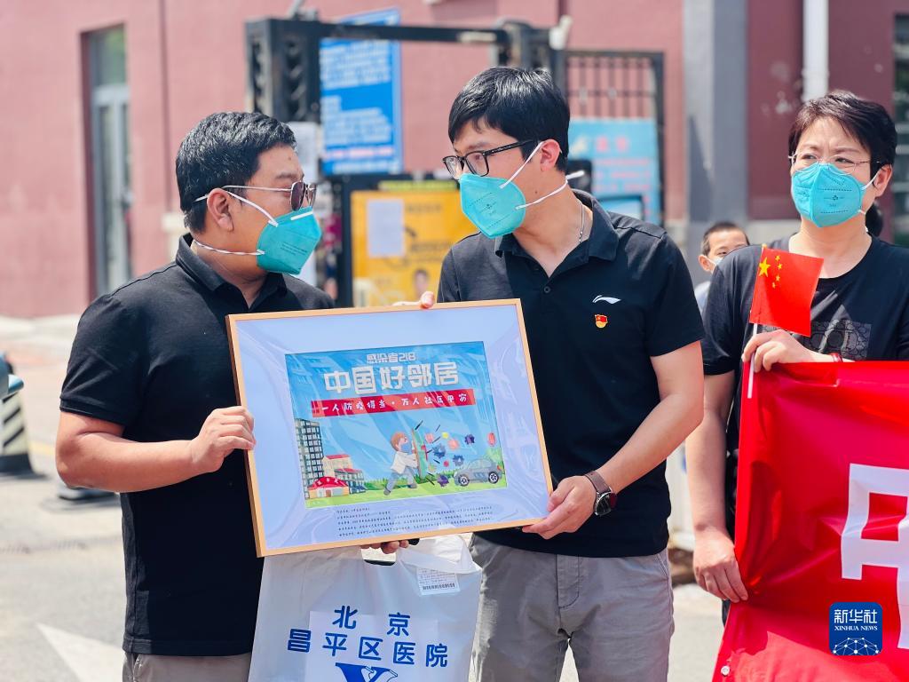 张旭(左一)康复后回到小区,收到了一幅主题为“中国好邻居”的手工艺品礼物(5月18日摄)。