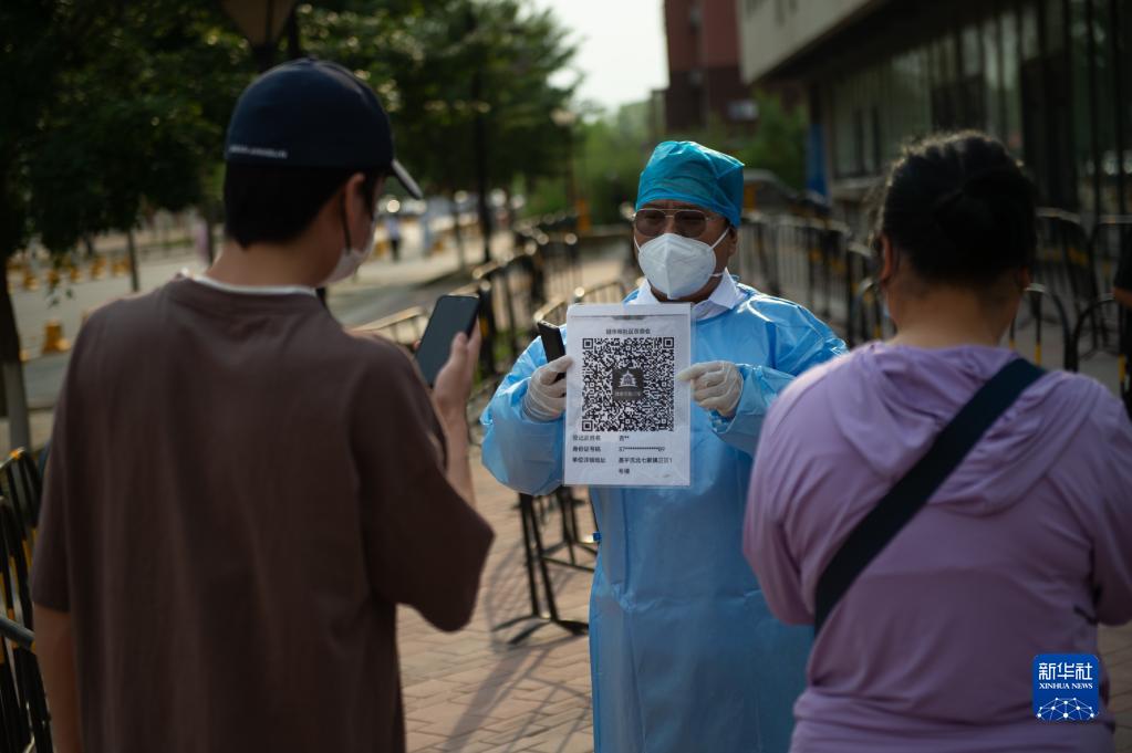 6月3日,张旭引导前来进行核酸采样的居民扫描北京健康宝。