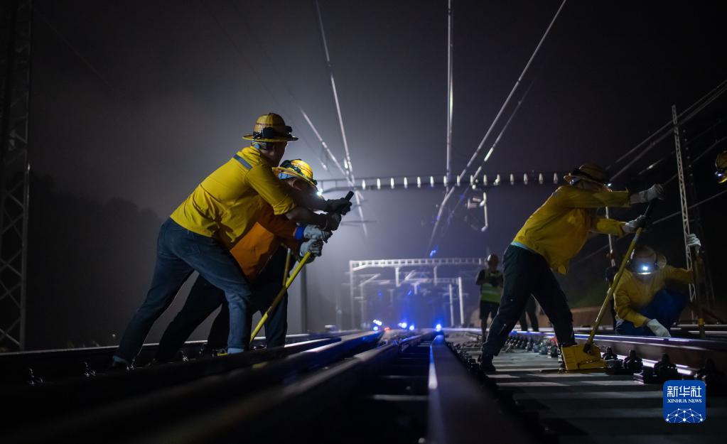 中国铁路昆明局集团普洱基础设施段的工人在中老铁路上施工(6月1日摄)。