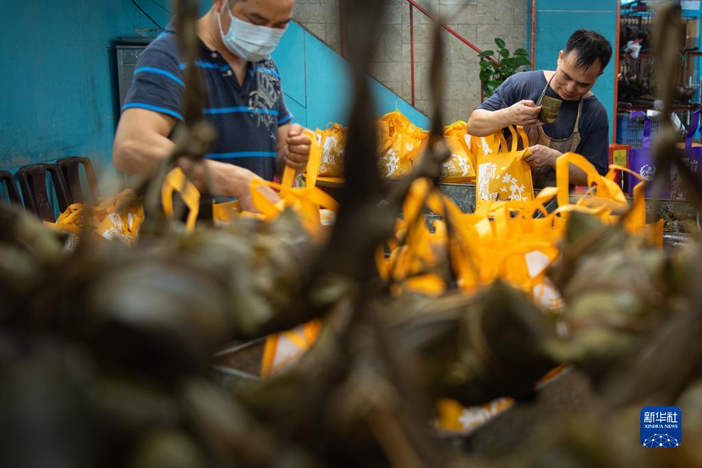 5月31日,传统茶楼兰香阁的员工在包装粽子。