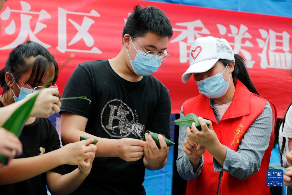 6月3日,在四川雅安市芦山县太平镇太平中学安置点,志愿者(右)教暂住在这里的学生包粽子。