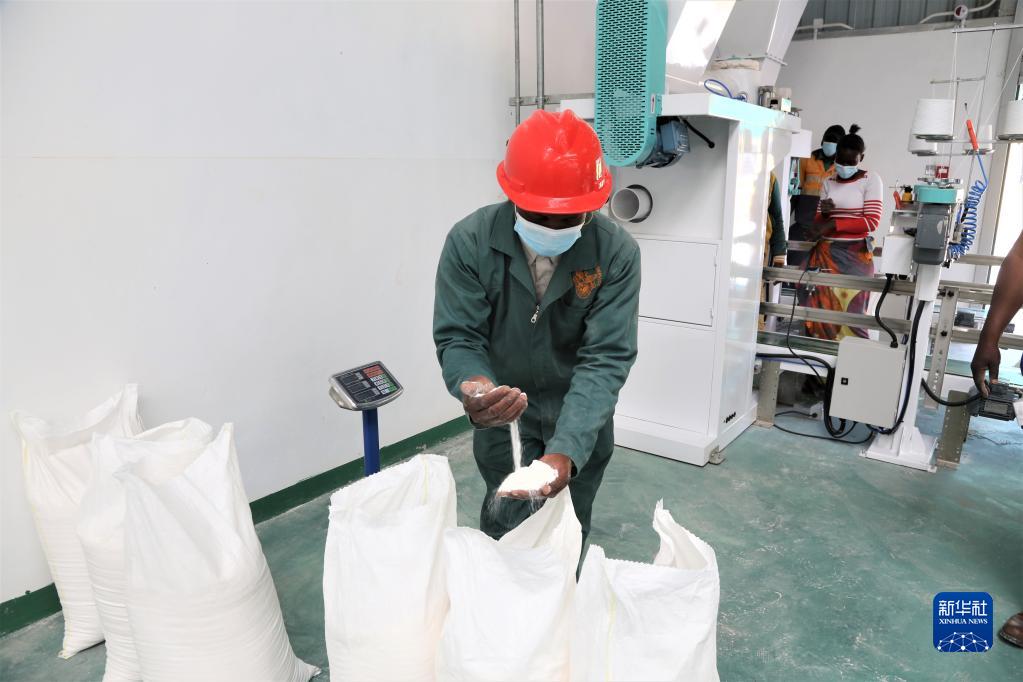 6月2日,在赞比亚卢萨卡,工人在中国政府援建的玉米粉加工厂检查玉米粉质量。
