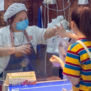6月3日,消费者在重庆观音桥商圈好吃街一家门店购买美食。