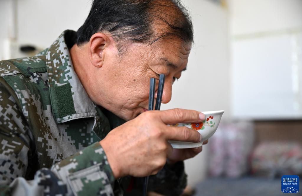 6月2日,朱金保在八仙山聚仙峰峰顶的森林防火管理站内吃早餐。