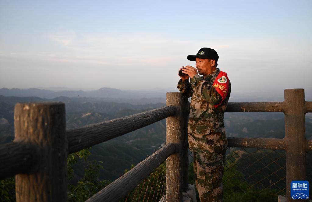6月1日,朱金保在八仙山聚仙峰峰顶用望远镜远眺观察。