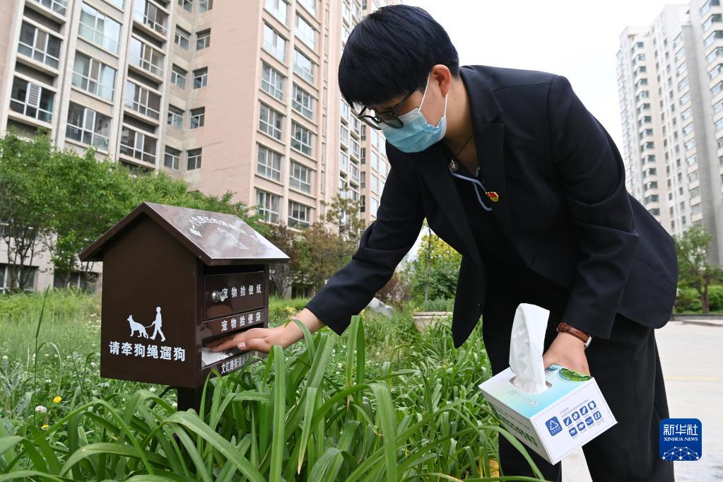 6月2日,在西宁市城西区文汇园小区,物业工作人员为宠物拾便纸箱添加纸张。