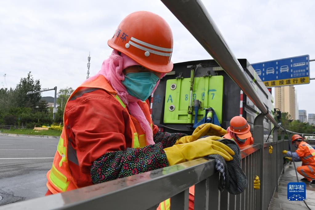 6月2日,在西宁市城西区五四西路,环卫工人清洁道路护栏。