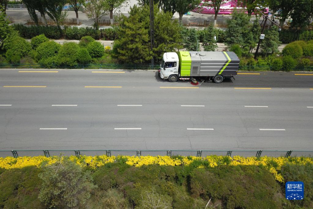这是6月2日在西宁市城西区拍摄的作业中的环卫洗扫车(无人机照片)。