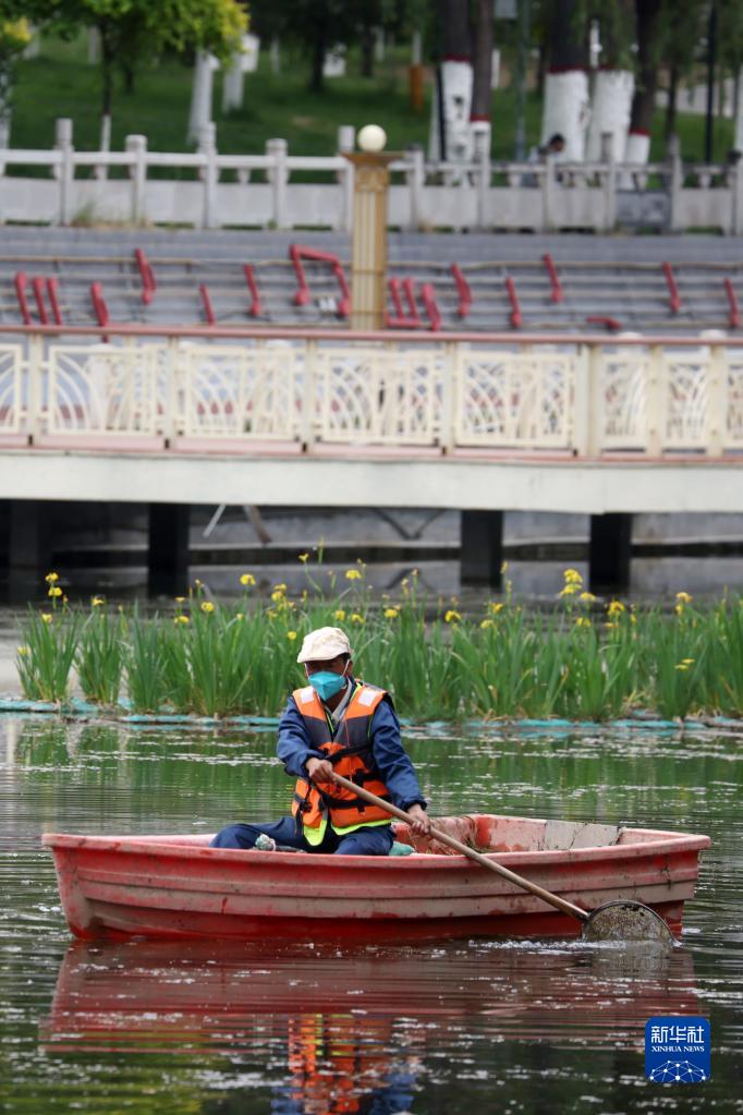 6月2日,环卫工人清理西宁市南川河河道中杂物。