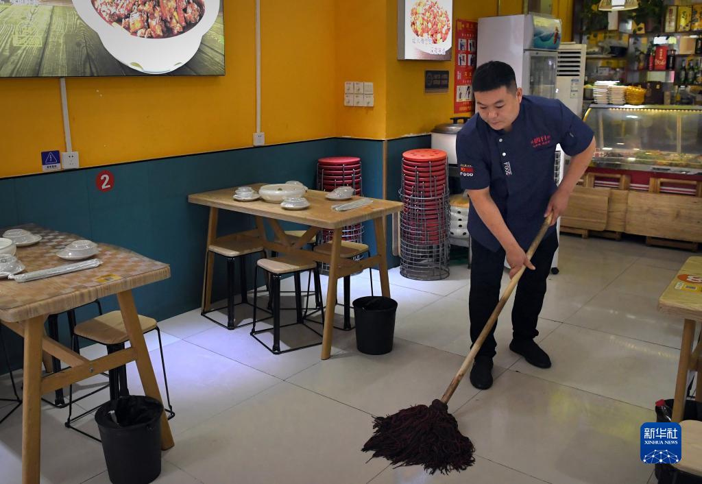 张占领在位于郑州市二七区的店铺内打扫卫生(5月31日摄)。