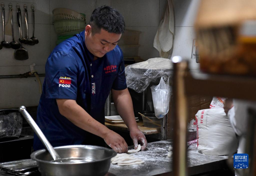 张占领在位于郑州市二七区的店铺内制作面食(5月31日摄)。