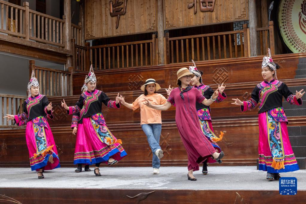 6月4日,游客在浙江省丽水市景宁畲族自治县大均乡大均村体验畲族舞蹈。