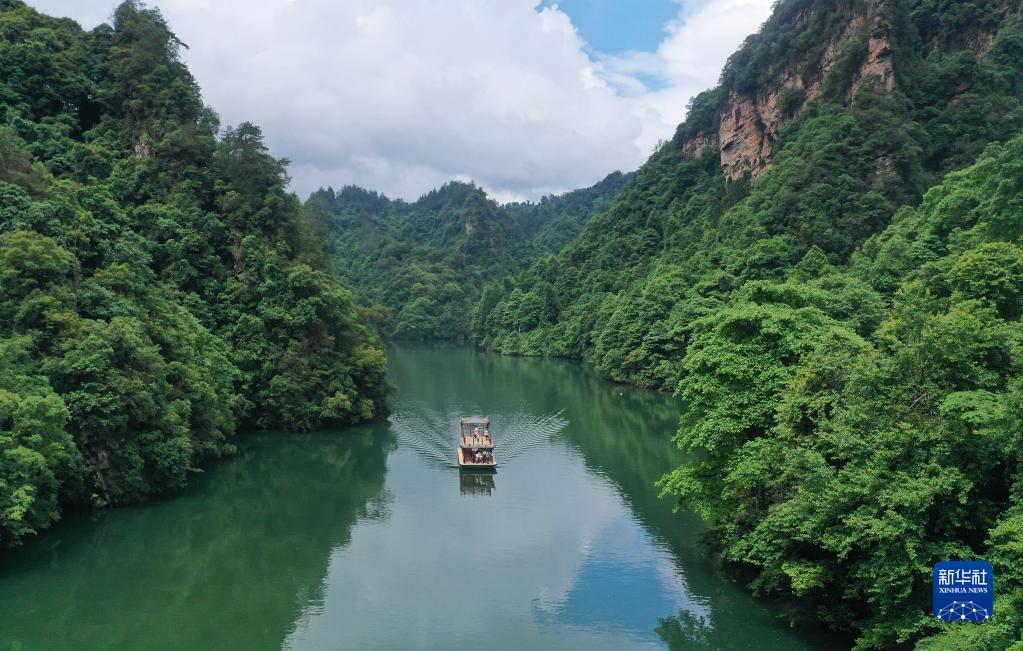 6月4日,游人乘船在湖南省张家界市武陵源区宝峰湖游玩。