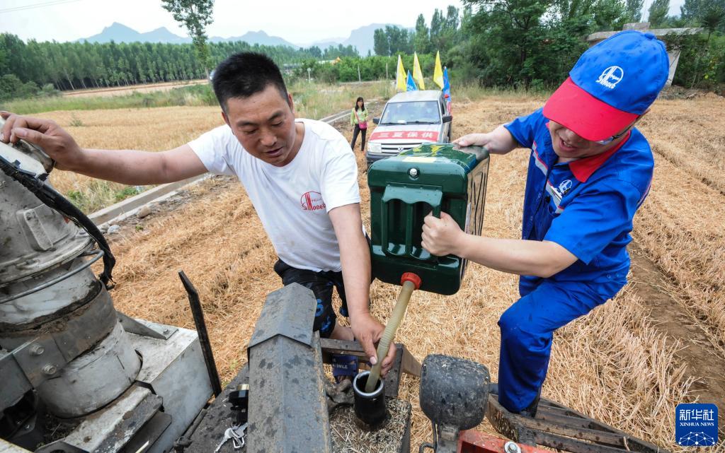 6月4日,中石化工作人员在河南省济源市克井镇的麦田里为一台大型联合收割机加油。