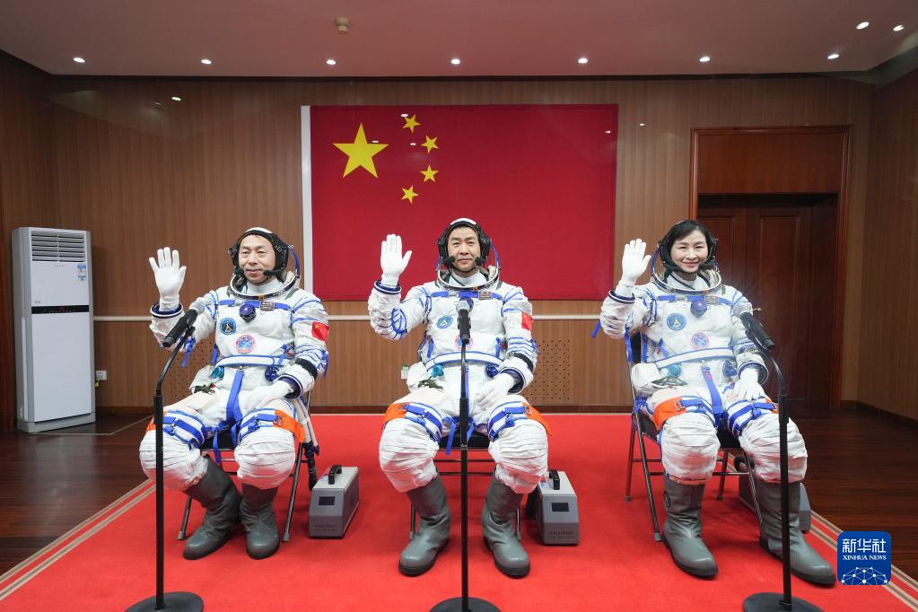 6月5日,神舟十四号载人飞行任务航天员乘组出征仪式在酒泉卫星发射中心举行。陈冬(中)、刘洋(右)、蔡旭哲即将开启为期6个月的飞行任务。