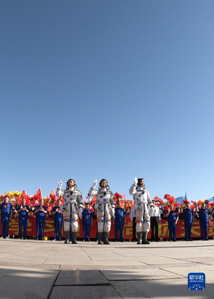 6月5日,神舟十四号载人飞行任务航天员乘组出征仪式在酒泉卫星发射中心问天阁广场举行。陈冬(右)、刘洋(中)、蔡旭哲即将开启为期6个月的飞行任务。