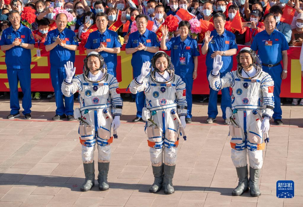 6月5日,神舟十四号载人飞行任务航天员乘组出征仪式在酒泉卫星发射中心问天阁广场举行。陈冬(右)、刘洋(中)、蔡旭哲即将开启为期6个月的飞行任务。