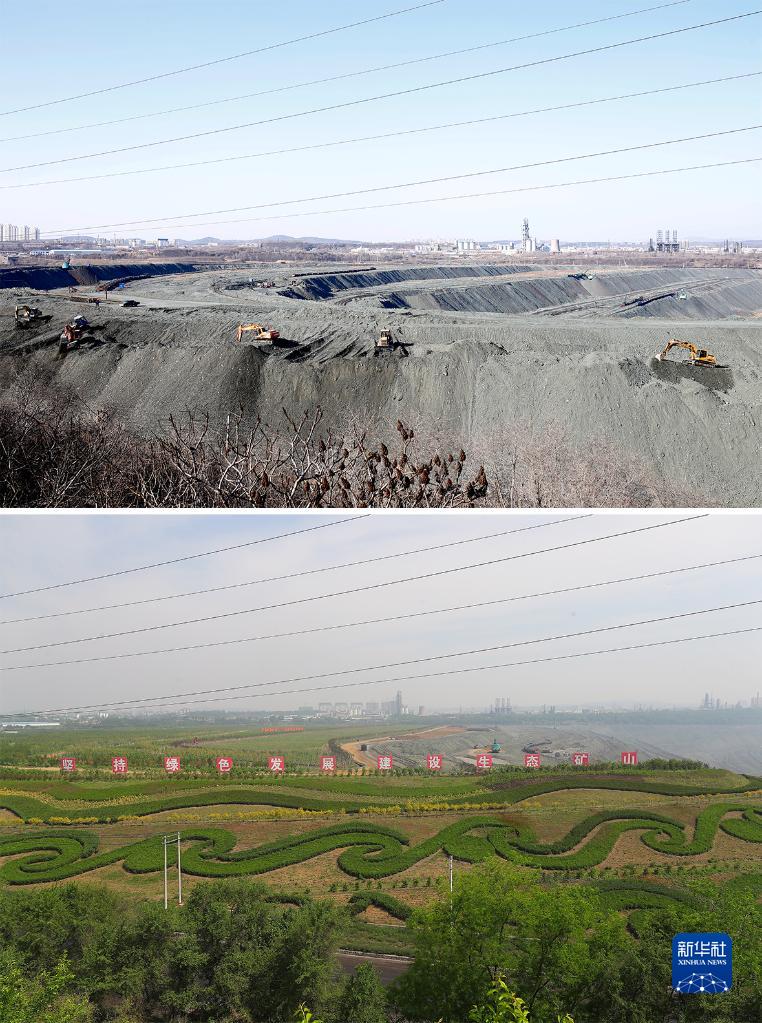 拼版照片:上图为抚顺西露天矿部分区域生态恢复前的场景(2019年3月6日摄,抚矿集团供图);下图为抚顺西露天矿部分区域生态恢复后的场景( 新华社记者杨青2022年6月2日摄,无人机照片)。