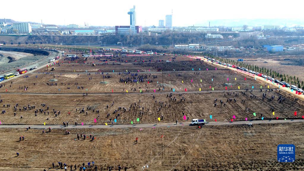 2020年4月10日,抚顺矿业集团有限责任公司组织员工在西露天矿植树(无人机照片)。