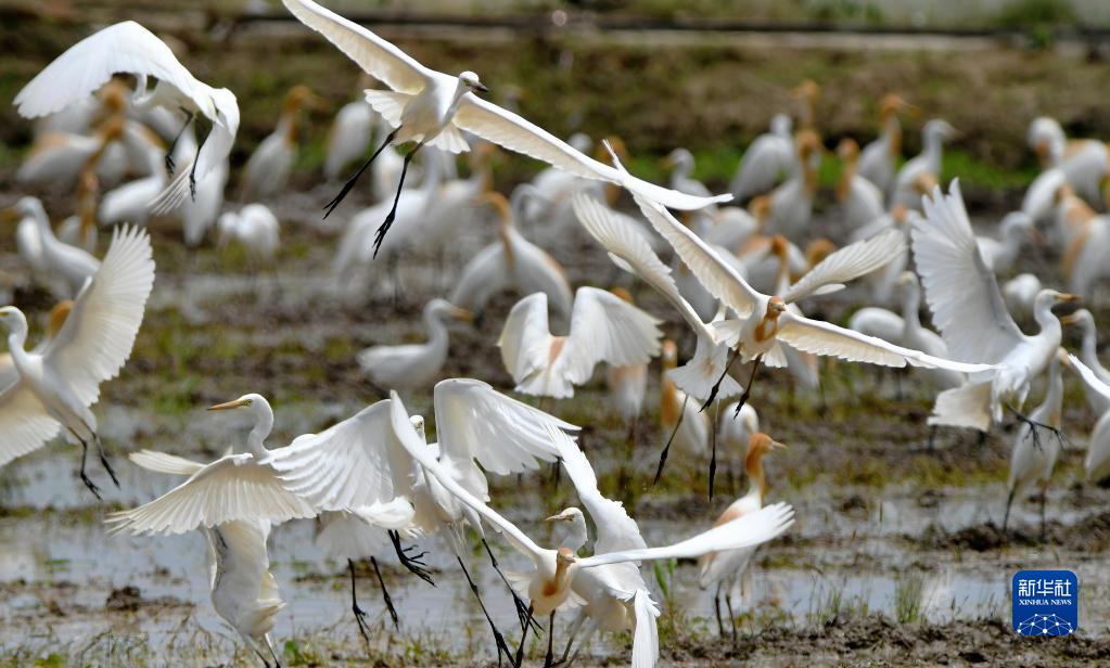 大批鹭鸟在连江县山堂村的稻田里觅食嬉戏(5月29日摄)。