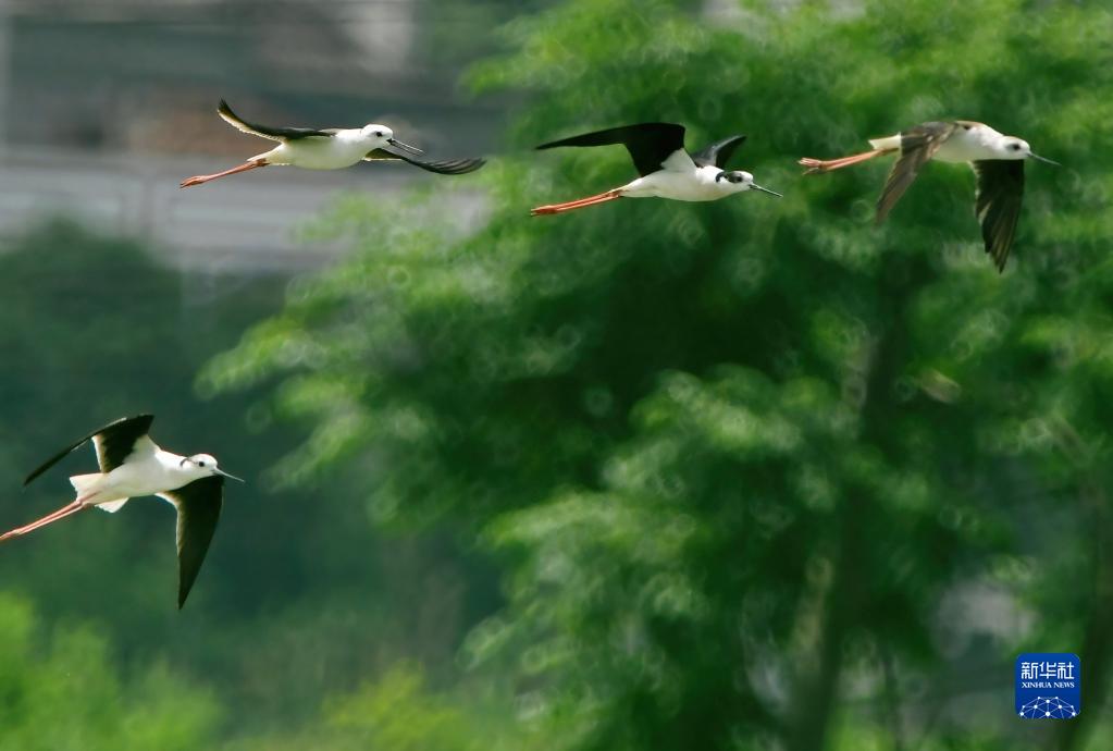 几只黑翅长脚鹬飞过连江县山堂村(5月29日摄)。
