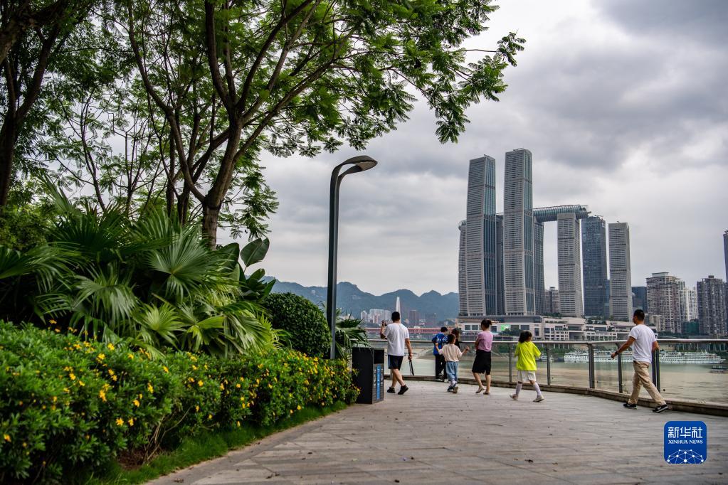 6月4日,人们在重庆南滨路的亲水步道游玩,远处是重庆地标性建筑重庆来福士。