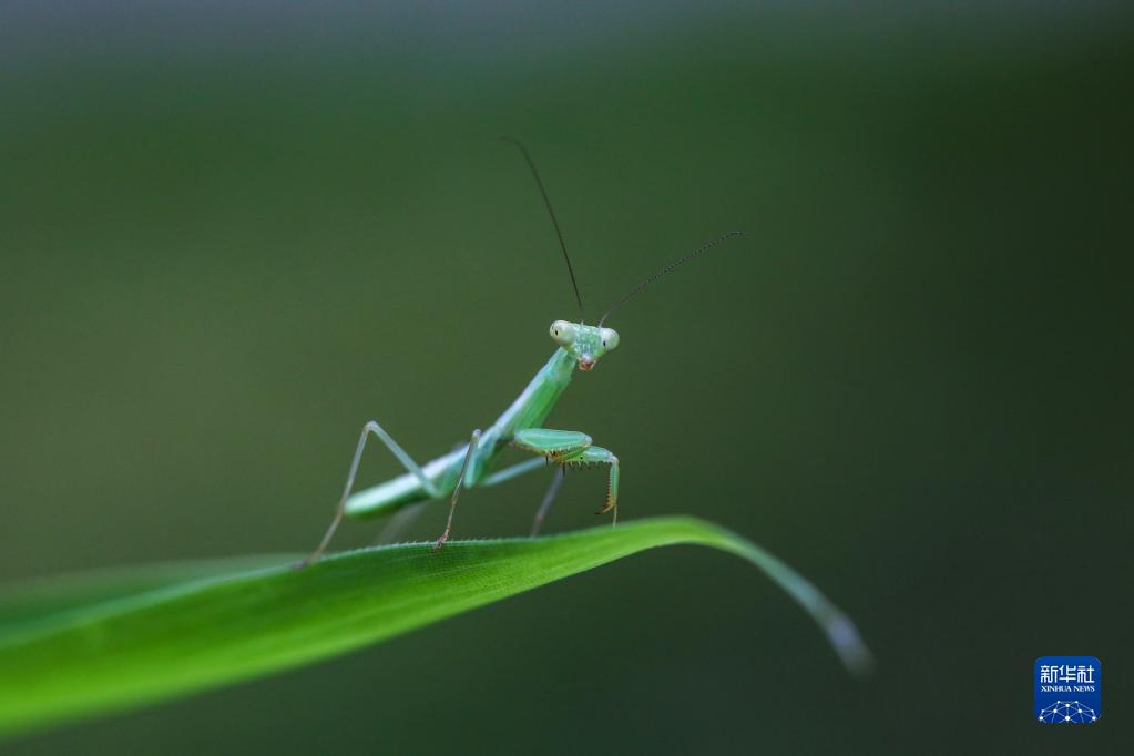 5月29日,在云南省红河哈尼族彝族自治州蒙自市和润小区,一只幼小的螳螂爬上竹叶。芒种节气三候中第一候为“螳螂生”。
