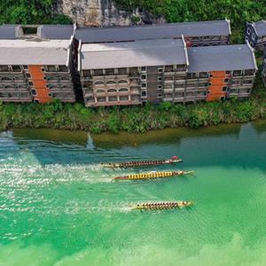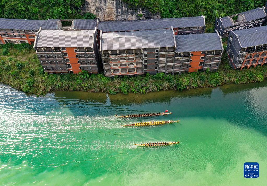 6月1日,龙舟队在贵州省黔东南苗族侗族自治州镇远县㵲阳河上进行比赛(无人机照片)。