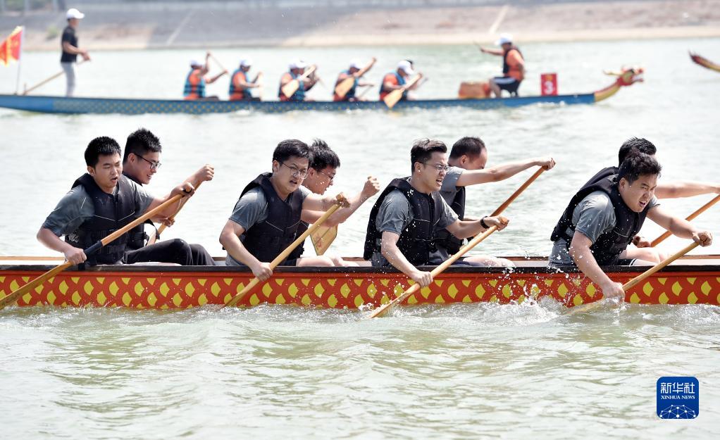 6月3日,在江苏省扬州市,由扬州市生态科技新城青年人才代表组成的一支龙舟队在龙舟赛现场激烈角逐。