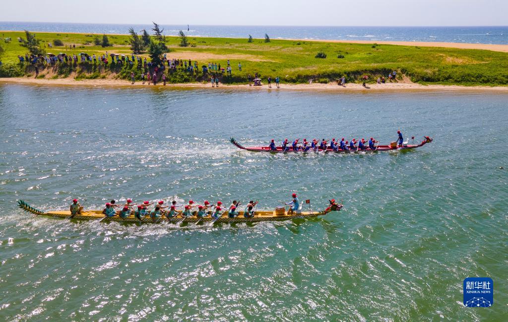 6月3日,在海南省琼海市博鳌镇万泉河入海口,人们参加赛龙舟活动(无人机照片)。