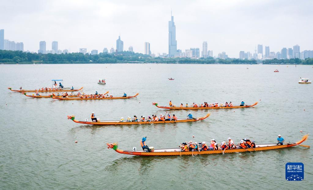 6月3日,人们在南京玄武湖上参加亲子划龙舟活动(无人机照片)。