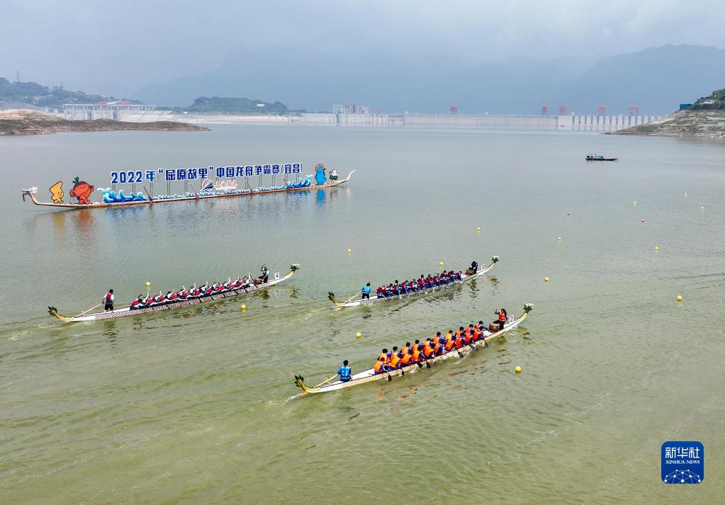6月3日,人们在三峡大坝前的湖北省秭归县水域参加2022年“屈原故里”中国龙舟争霸赛(无人机照片)。