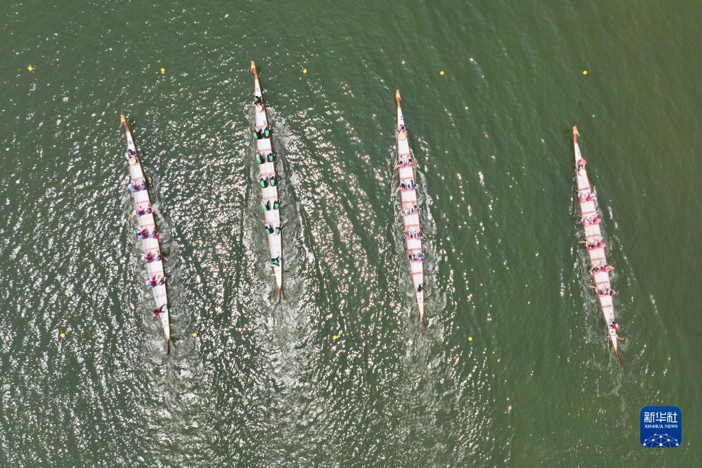 6月3日,在江苏省连云港市石梁河水库,选手参加龙舟比赛(无人机照片)。