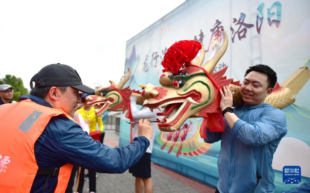 6月3日,在河南省洛阳市凌波湖的龙舟比赛现场,人们参加龙舟点睛活动。