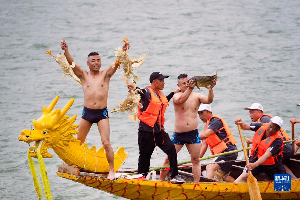 6月3日,第二十二届中国安康汉江龙舟节在陕西省安康市汉江上举行,参赛队员表演抓鲤鱼和活鸭。