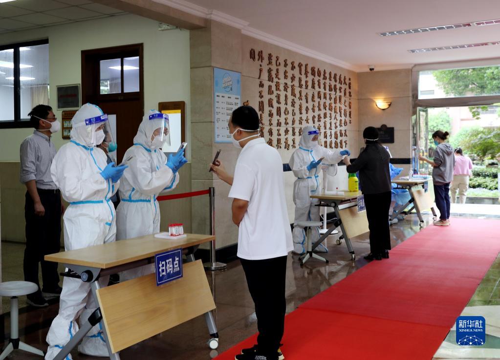 6月5日,上海市大同中学的教师职工在进行每日核酸采样实操演练。