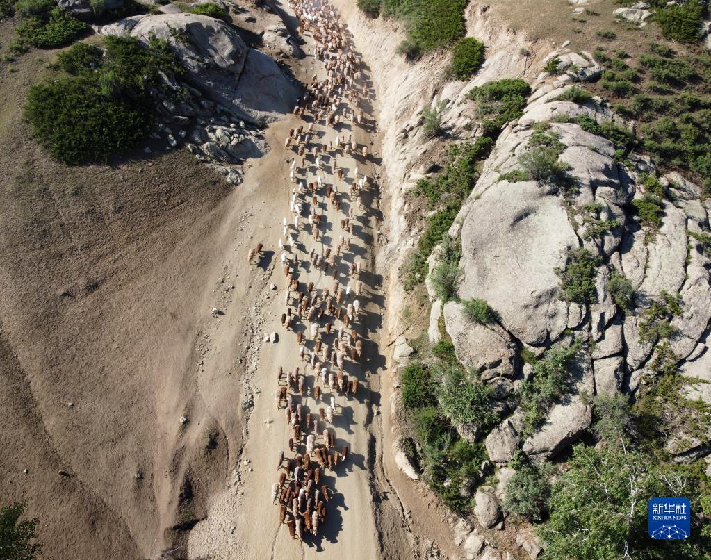 6月5日在新疆阿勒泰地区福海县沙尔布拉克春秋牧场转往夏季牧场的牧道上拍摄的羊群(无人机照片)。