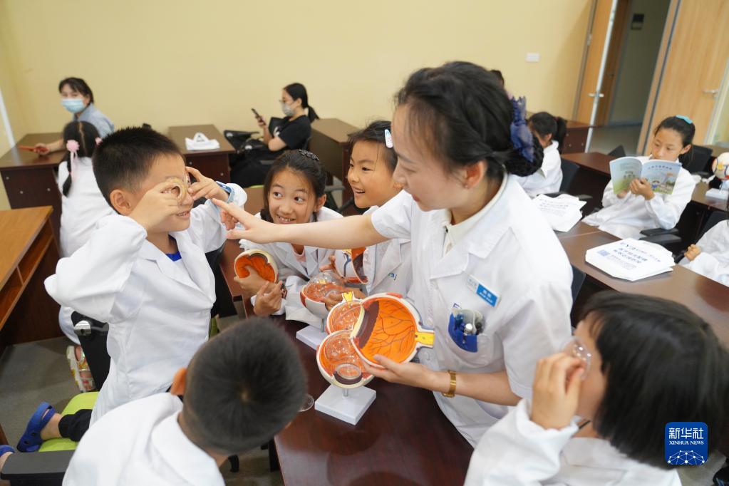 6月5日,在重庆市北碚区一家眼科医院,一名验光师在给孩子们讲解眼球构造知识。